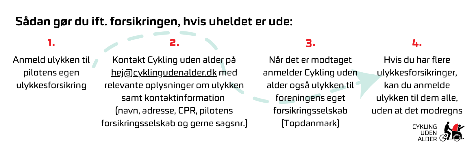 Piloter, der er lært op i at cykle rickshawcyklen og er medlem af foreningen Cykling uden alder er omfattet af en ulykkes- og ansvarsforsikring hos Topdanmark. Oplærte piloter registreres i foreningens tilmeldings- og bookingsystem Book2Go.
